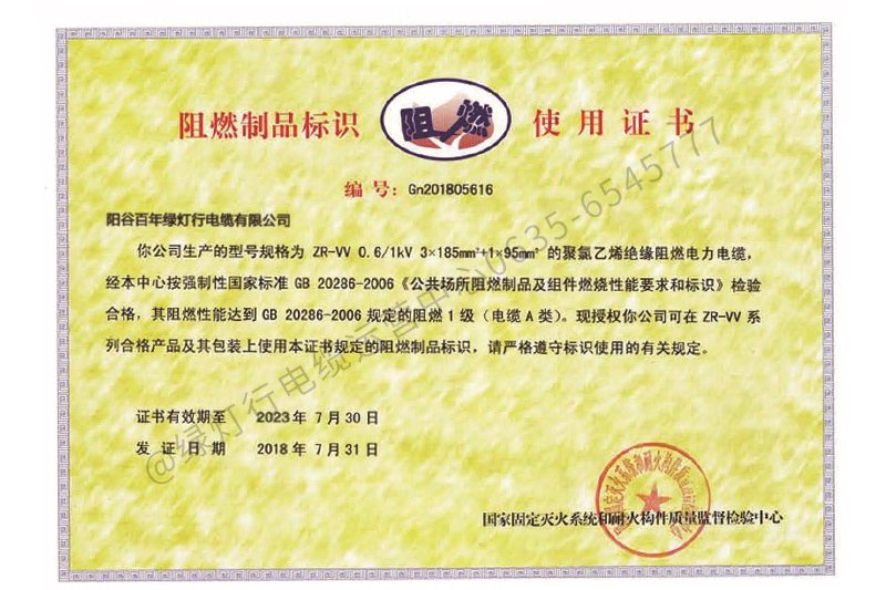 阻燃制品標(biāo)識使用證書