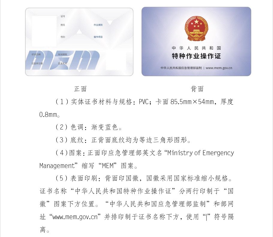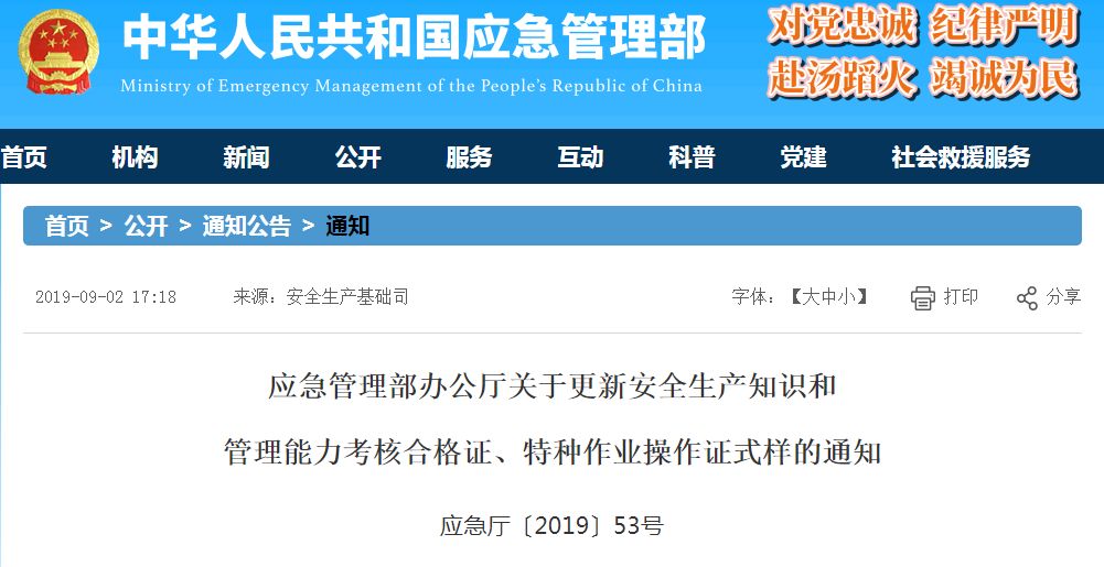 根據(jù)國(guó)家最新發(fā)布的消息,中華人民共和國(guó)應(yīng)急管理部于2019年8月10日發(fā)布了《應(yīng)急管理部辦公廳關(guān)于更新安全生產(chǎn)知識(shí)和管理能力考核合格證、特種作業(yè)操作證式樣的通知》“應(yīng)急廳〔2019〕53號(hào)文件,對(duì)安全生產(chǎn)知識(shí)和管理能力考核合格證和特種作業(yè)操作證的式樣進(jìn)行了更新。