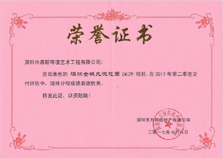 追求完美,創(chuàng)造卓越。2017年7月6日萬科地產(chǎn)在2017年年度第二次項目檢查評比交付評估會議中,由我司建設的萬科金域九悅花園再次以優(yōu)秀的成績?nèi)〉昧巳f科地產(chǎn)頒發(fā)的榮譽證書及獎勵。這表示著中國十大地產(chǎn)商對我施工單位的無私奉獻、頑強拼搏的施工風范及為業(yè)主服務的理念留下了深刻印象,并贏得了業(yè)主及甲方的高度稱贊。