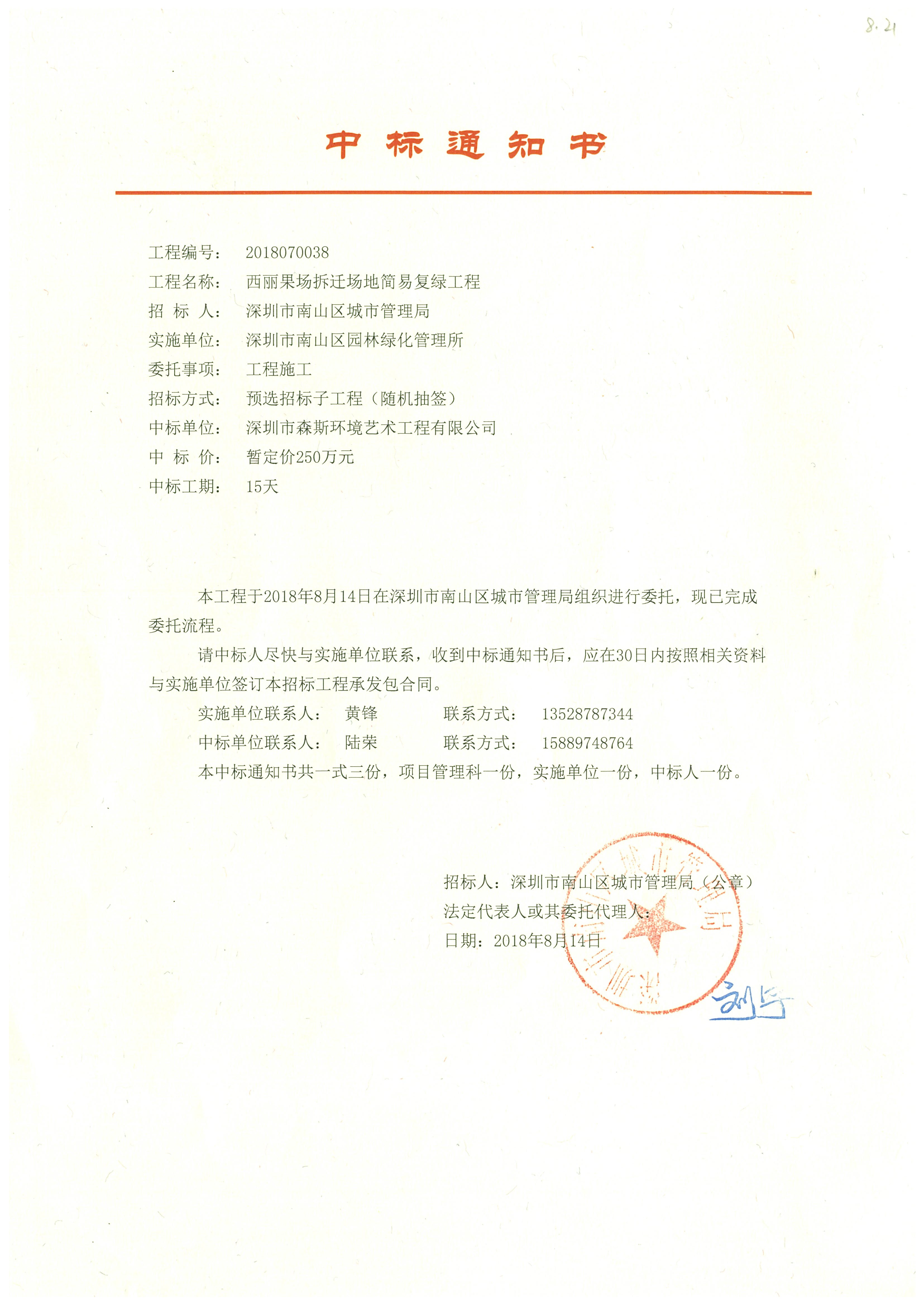 恭喜公司中標西麗果場拆遷場地簡易復綠工程,項目總價暫定250萬元