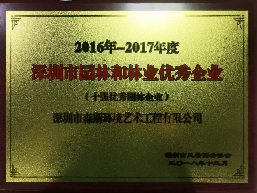 為了促進深圳市園林企業(yè)的可持續(xù)發(fā)展,深圳市風景園林協(xié)會組織開展評選活動并在大會上進行表彰,其中,森斯環(huán)境榮獲“深圳市十強優(yōu)秀園林企業(yè)”的殊榮。我司能榮獲此項殊榮,充分展現(xiàn)了企業(yè)自身實力以及業(yè)界對我司的認可。在將來,森斯環(huán)境也將不負業(yè)界及客戶的支持與厚望,再接再厲,牢記企業(yè)使命“推動人與自然和諧發(fā)展”的價值觀,為我國生態(tài)文明建設事業(yè)獻出自己的一份力。