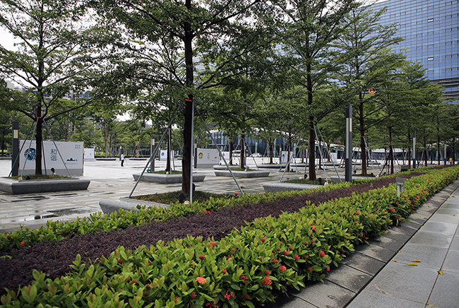 光明區城市廣場園林綠化工程主要施工內容包含:山體擋墻立體綠化、噴泉、廣場鋪裝、綠化種植、大型坐凳樹池、漢白玉旗臺、墻面石材干掛、雨水回收利用系統等。竣工1年來,已經受臺風“山竹”的考驗,植物長勢喜人,景觀效果良好,現已成為光明區的一張綠色名片,獲得周邊市民一致好評,也得到了市風景園林協會考評專家的高度贊譽!