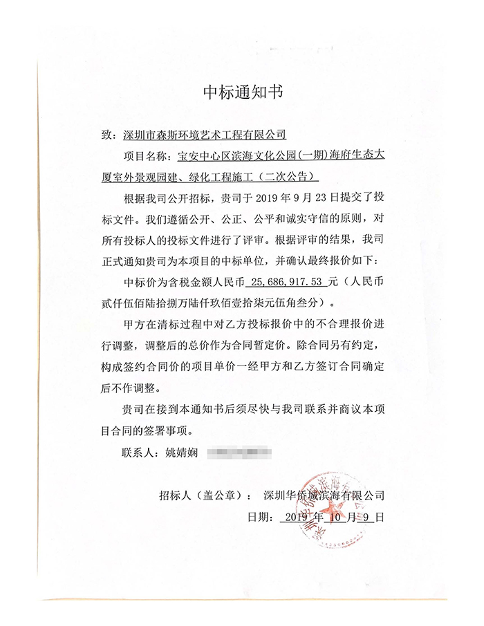 喜訊 | 森斯環境中標寶安中心區濱海文化公園(一期)海府生態大廈室外景觀園建、綠化工程施工(二次公告)