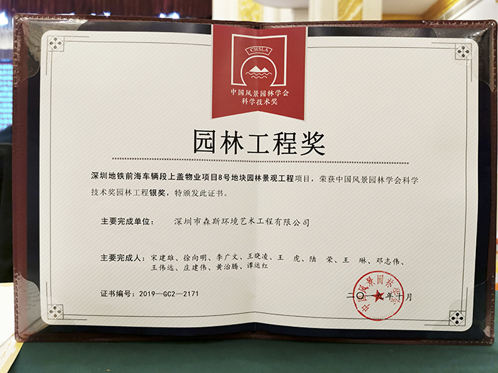 ? 森斯環(huán)境“深圳地鐵前海車輛段上蓋物業(yè)項目8號地塊園林景觀工程”項目榮獲中國風(fēng)景園林學(xué)會科學(xué)技術(shù)獎園林工程銀獎