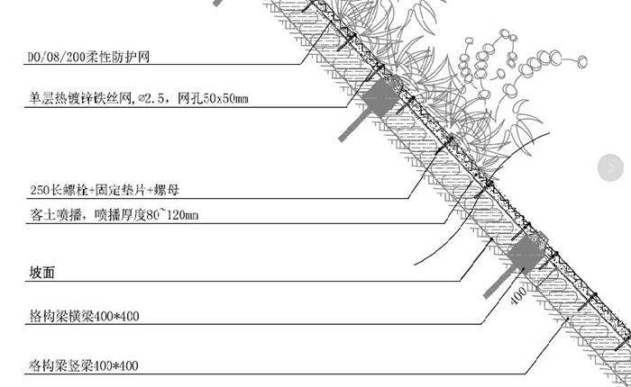 熱鍍鋅鐵絲網(wǎng)規(guī)格:Φ2,50x50mm,錨桿錨固選用25cm長的m12螺栓植入混凝土格構(gòu)梁18cm,間距為500mm,加裝定制墊片、螺母固定鐵絲網(wǎng),兩層網(wǎng)之間保證間距5cm。