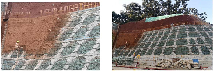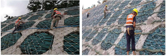 本項(xiàng)目是有格構(gòu)梁的邊坡,設(shè)計要求是在格構(gòu)梁內(nèi)堆填生態(tài)袋、掛網(wǎng)(一道柔性防護(hù)網(wǎng)、一道鍍鋅鐵絲網(wǎng))、生態(tài)棒安裝、客土、噴草灌籽、后期扦插開花灌木。