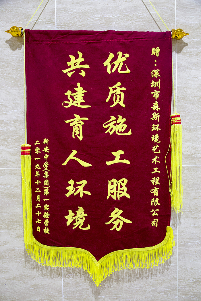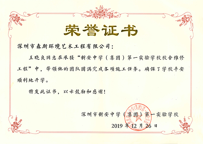 2020年新年的第二天,由森斯環境施工的新安中學(集團)第一實驗學校校舍維修改造工程,傳來了2020年開年第一個喜訊!深圳市新安中學(集團)第一實驗學校為感謝森斯環境在承接本項目后,保質保量的按時完成各項施工任務,確保了學校平安順利開學,特贈予我司“優質施工服務?共建育人環境”錦旗,并向項目負責人頒發榮譽證書,以示鼓勵和感謝。