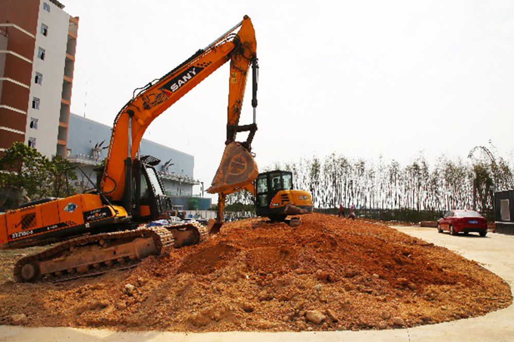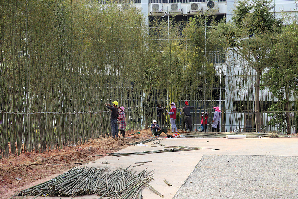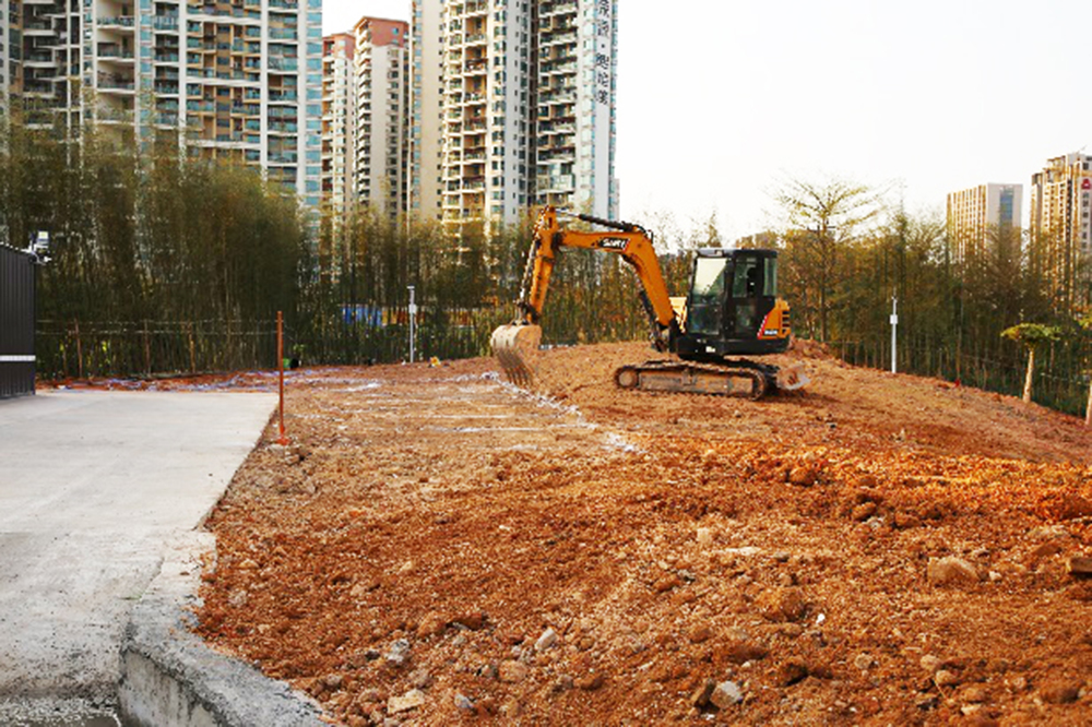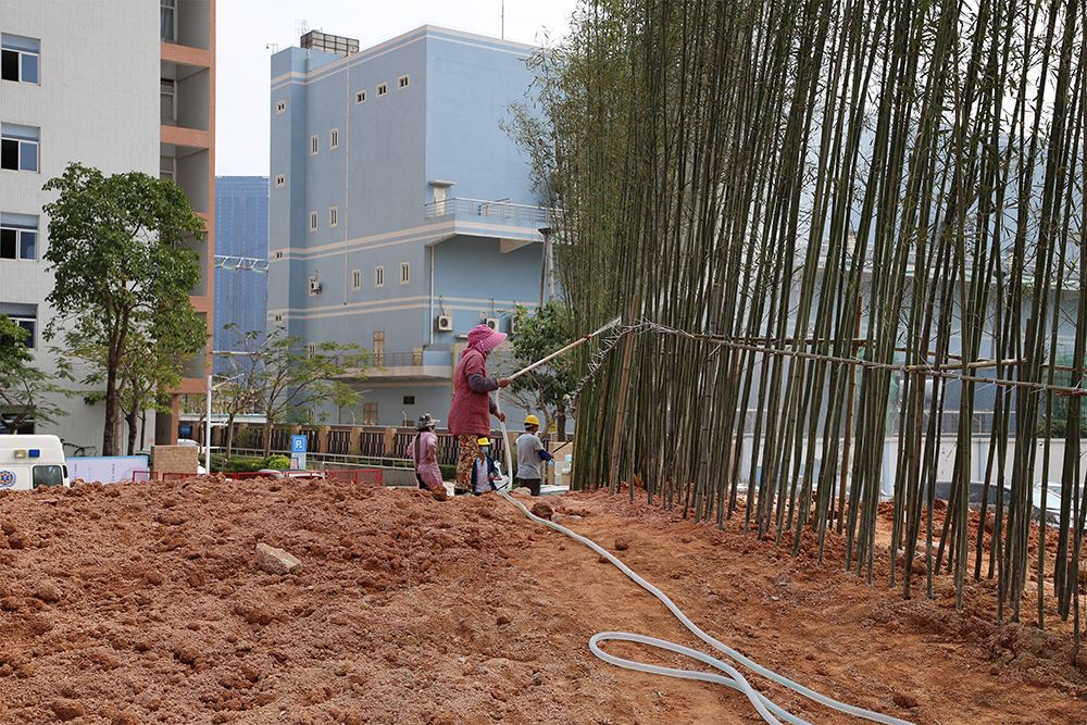 為確保施工現場安全有序進展,公司每天都有 30 多名技術施工人員和 2 臺機械設備施工作業?,F階段已經基本完成地形平整和微地型藝術造型,已經完成建筑外圍剛竹林帶的種植。完工時間指日可待!