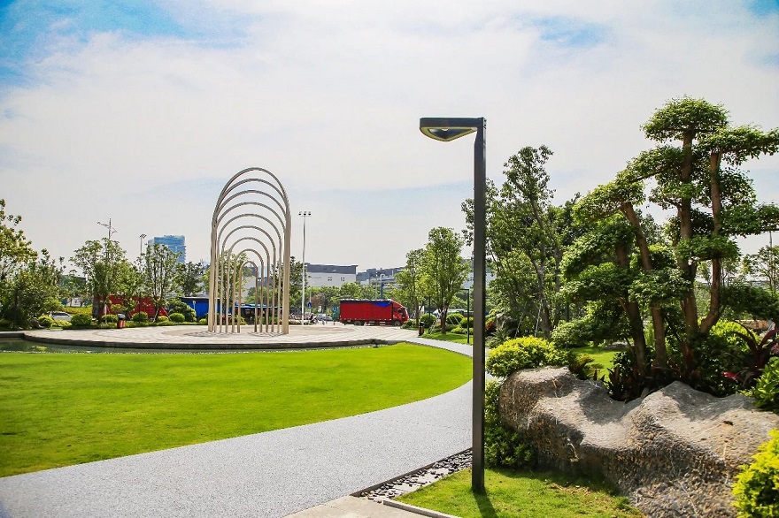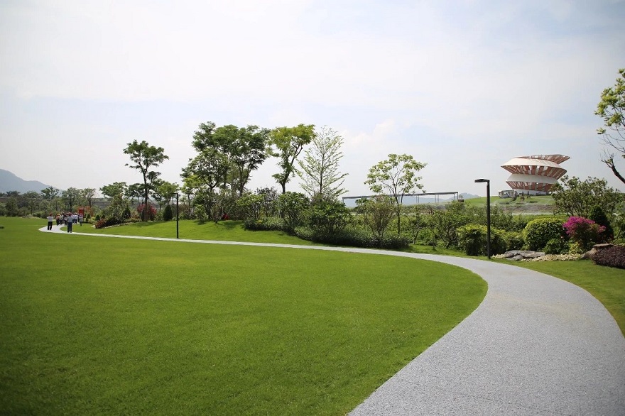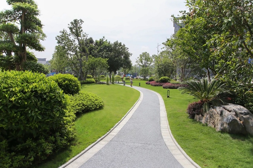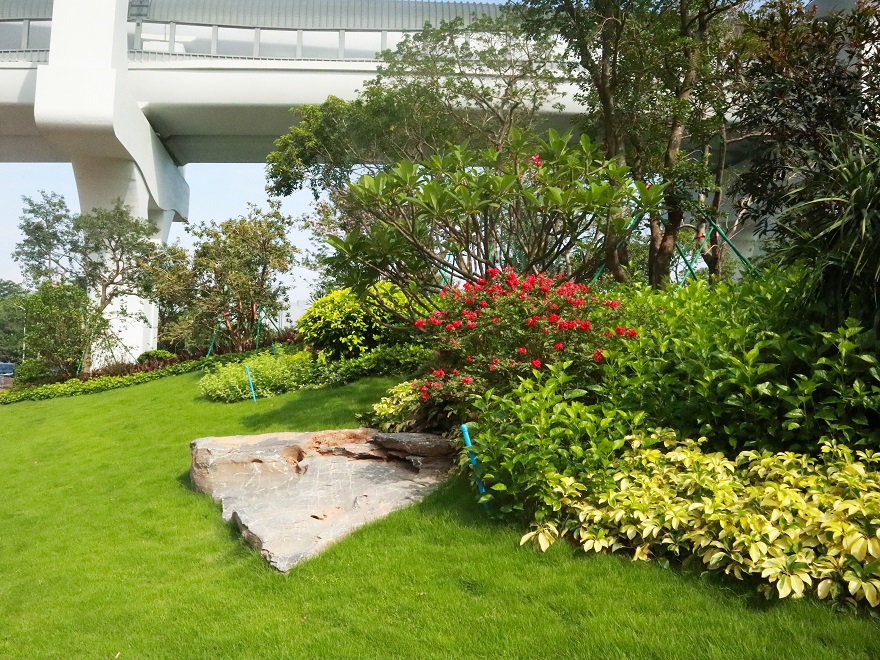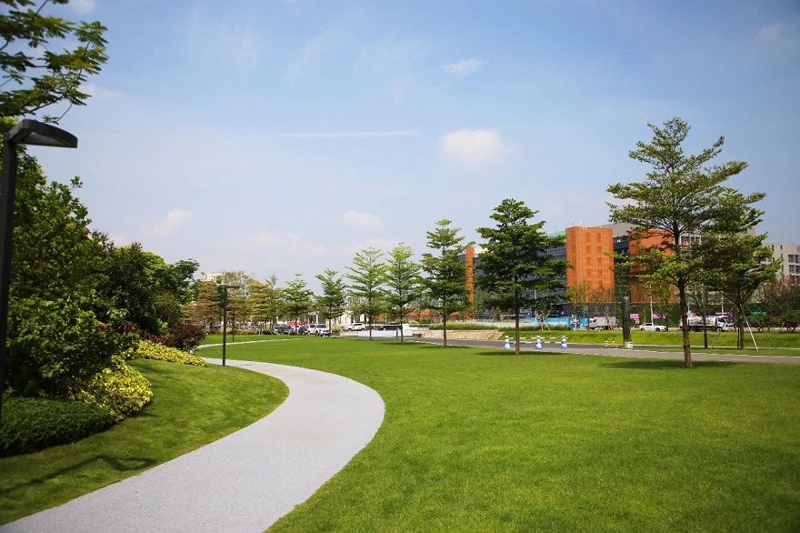 如“歐美小鎮”般的科學城展覽中心,草皮采用的是夏威夷草海濱雀稗 ,是較接近高爾夫球場草地的標準;地形基礎做好后用壓路機壓平,再混入營養土,放沙;生長的草埋入五公分左右,要適當控制其生長,盡可能避免草坪發生高低變化的現象。舊時坑洼的水溝改造成旱溪景觀,與水生植物的搭配形成了一道亮麗的風景。