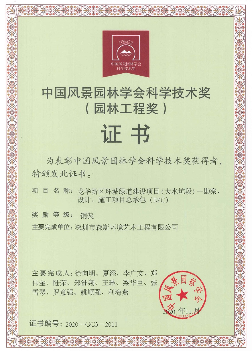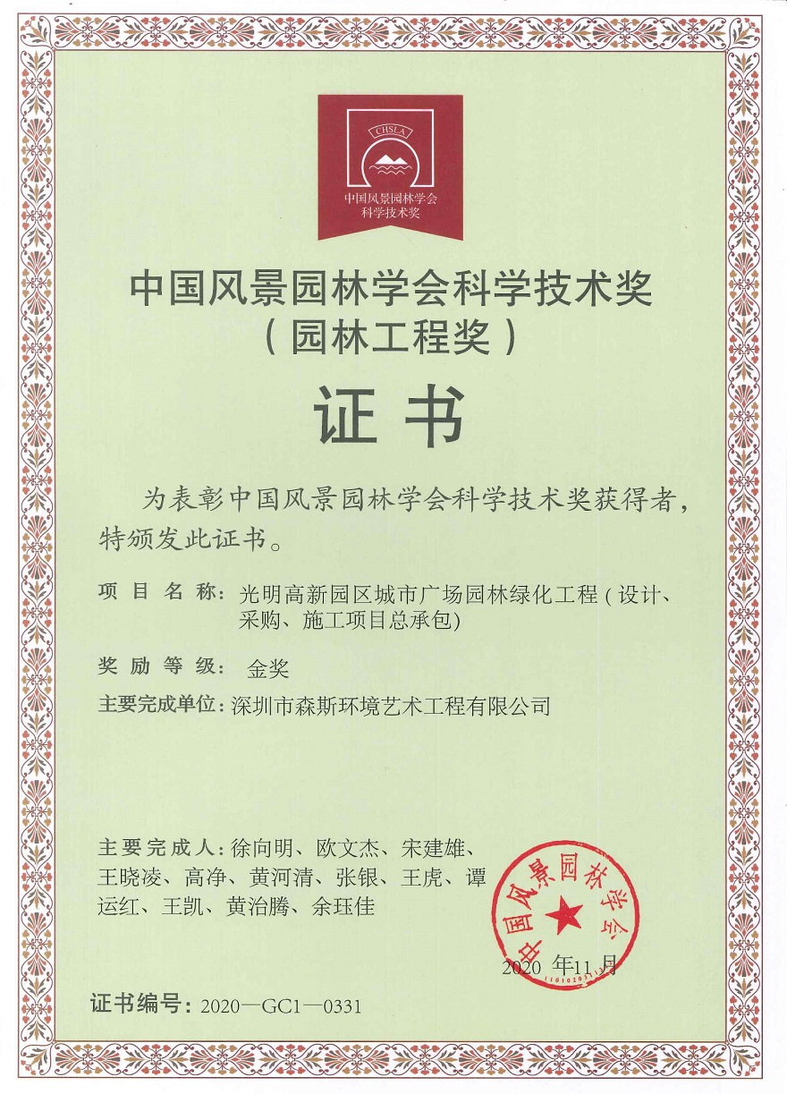 中國風景園林學會科學技術獎--金獎的榮獲項目為光明高新園區城市廣場園林綠化工程(設計、采購、施工項目總承包),是由深圳市森斯環境藝術工程有限公司承包建設的重點工程。本項目位于深圳市光明區高新園區,項目工程造價3611萬元,總占地面積為65544平方米,整體景觀以中軸線展開設計,包山體、水體、及廣場 ,構圖方正嚴謹,整體強調以生態和諧為原則,達到人與自然的和諧,施工內容包含:山體擋墻立體綠化、噴泉、 廣場鋪裝、大型坐凳樹池、漢白玉旗臺、墻面石材干掛、雨水回收利用系統等,其中特色景觀山體擋墻立體綠化 墻圖案以鳳凰為原型,延續中國的傳統文化,寓意光明區的發展不斷地向前推進,像祖國一樣欣欣向榮。