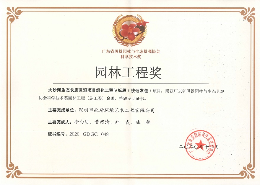 2020年度廣東省風景園林與生態景觀協會科學技術獎(園林工程獎)評審結果已公示,森斯環境承建的“坪西公路綠化工程項目”、“大沙河生態長廊景觀項目綠化工程IV標段(快速發包)項目”榮獲廣東省風景園林與生態景觀協會科學技術獎園林工程(施工類)金獎,森斯環境實力再獲權威肯定!