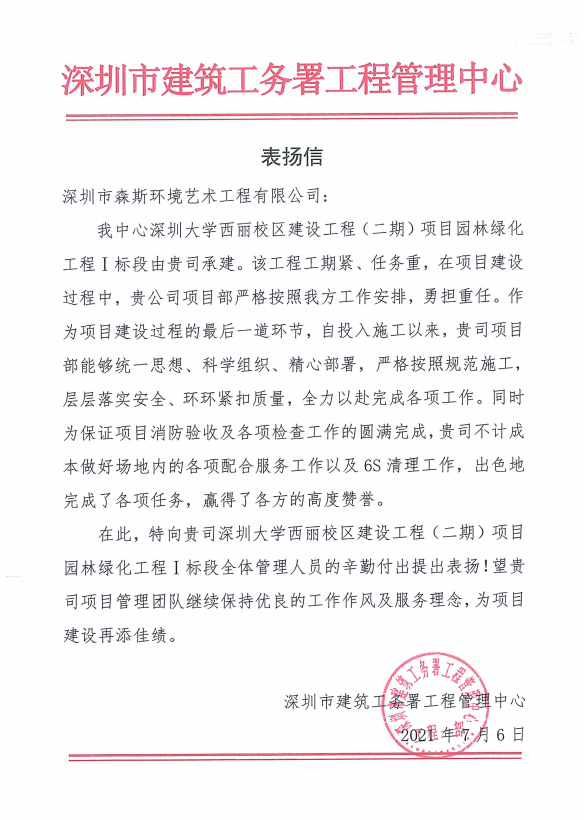 7月6日。深圳市建筑工務署工程管理中心向深圳市森斯環境藝術工程有限公司(簡稱森斯環境)發來一封表揚信,信中對我司在深圳大學西麗校區建設工程(二期)項目中的表現給予高度贊賞
