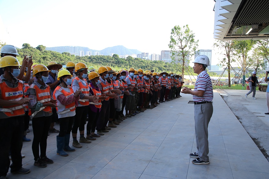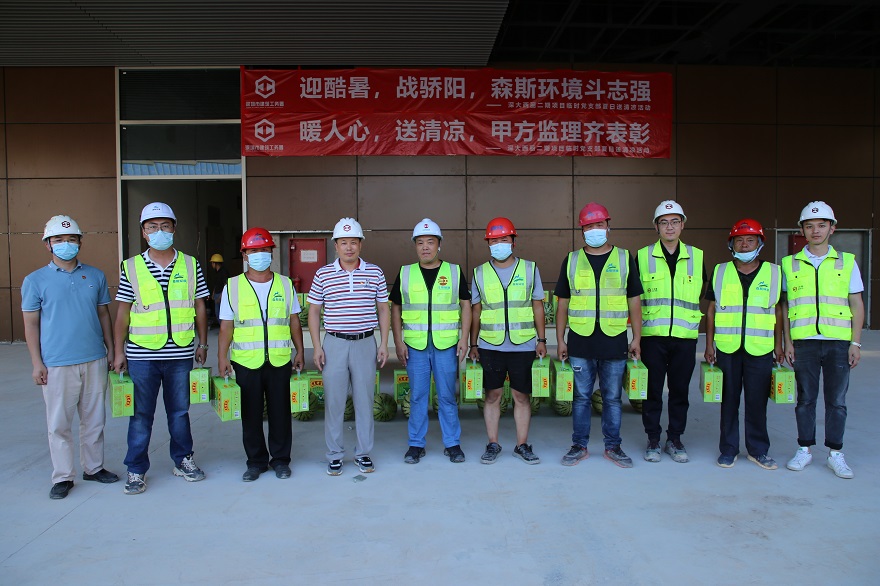 迎酷暑,戰(zhàn)驕陽,森斯環(huán)境斗志強(qiáng)。在連續(xù)長達(dá)兩個(gè)月的搶工奮戰(zhàn)中,深圳大學(xué)西麗校區(qū)二期項(xiàng)目即將完工,日夜奮戰(zhàn),不懼艱難的精神得到了深圳市建筑工務(wù)署工程管理中心和浙江江南工程管理股份有限公司的雙向表揚(yáng)。8月17日下午,深圳市建筑工務(wù)署工程管理中心項(xiàng)目主任劉峰一行來到深圳大學(xué)西麗校區(qū)二期項(xiàng)目現(xiàn)場慰問森斯環(huán)境深大項(xiàng)目團(tuán)隊(duì),為奮戰(zhàn)在一線的工人們送來防暑降溫物品,傳遞絲絲涼意,表達(dá)誠摯關(guān)懷。浙江江南工程管理股份有限公司項(xiàng)目經(jīng)理曹冬兵陪同。