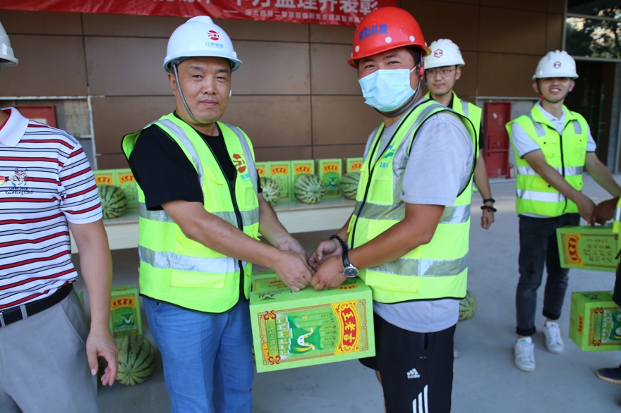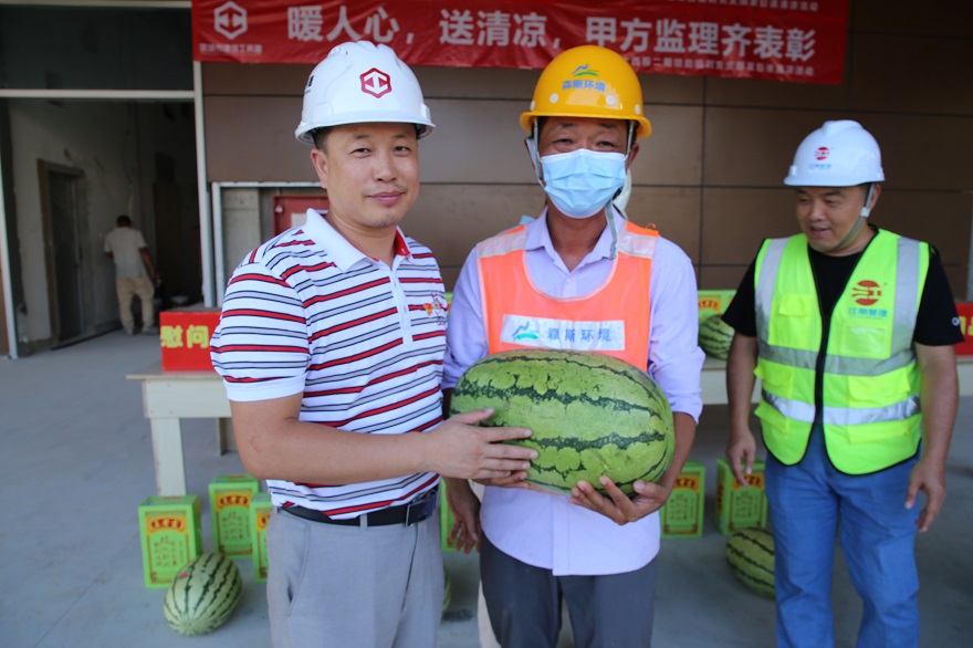 炎炎夏日送清涼,絲絲關(guān)愛沁心脾。深圳市建筑工務(wù)署工程管理中心項(xiàng)目主任劉峰一行向森斯環(huán)境深大項(xiàng)目團(tuán)隊(duì)送來了降暑飲料、西瓜等防暑降溫物品,表達(dá)了對奮戰(zhàn)在一線工作人員的關(guān)心和愛護(hù)。