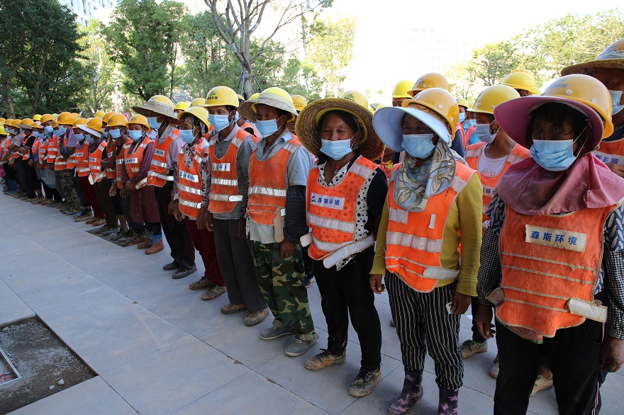 深圳市建筑工務(wù)署工程管理中心項(xiàng)目主任劉峰一行與森斯環(huán)境工人代表合影