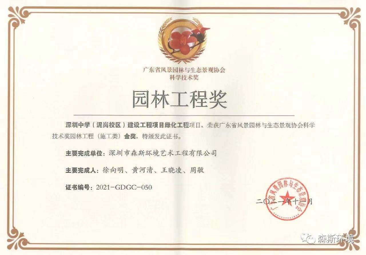 近日,廣東省風(fēng)景園林與生態(tài)景觀協(xié)會(huì)公布2021年度科學(xué)技術(shù)獎(jiǎng)園林工程獎(jiǎng)名單我公司榮獲科學(xué)技術(shù)獎(jiǎng)園林工程獎(jiǎng)(施工類)3項(xiàng)金獎(jiǎng)