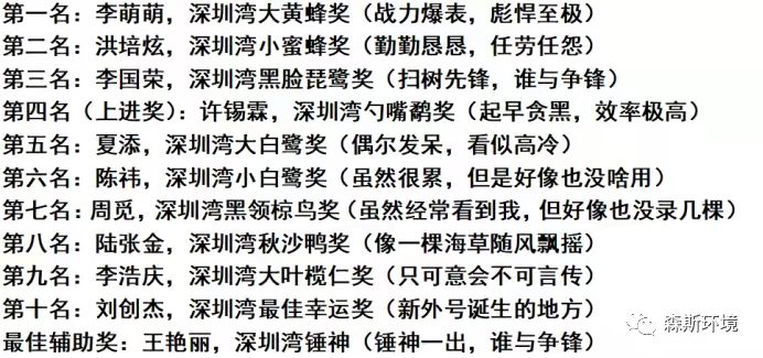 其后,對(duì)在此次深圳灣樹木調(diào)查工作中表現(xiàn)優(yōu)異的人員進(jìn)行表彰。此次深圳灣樹木調(diào)查工作中,涌現(xiàn)出一批既專業(yè),又扎實(shí)肯干的人才。他們不畏艱險(xiǎn),在坡度達(dá)50°的山坡和各種灌木叢中認(rèn)真執(zhí)行著樹木調(diào)查工作。其中,綠化資料報(bào)送崗李萌萌憑借著個(gè)人錄入量3470株的驕人戰(zhàn)績(jī)榮獲第一名,倉(cāng)管員王艷麗不分日夜,在輔助釘牌的工作上表現(xiàn)優(yōu)異,獲得最佳輔助獎(jiǎng)。由深圳灣公園管理處副主任連舜秋和深圳市森斯環(huán)境藝術(shù)工程有限公司董事長(zhǎng)徐向明共同為參與此次樹木普查工作的人員頒獎(jiǎng),獎(jiǎng)項(xiàng)全部以深圳灣公園常見的動(dòng)植物命名,凸顯了愛公園、保護(hù)公園的全體工作人員的心聲。