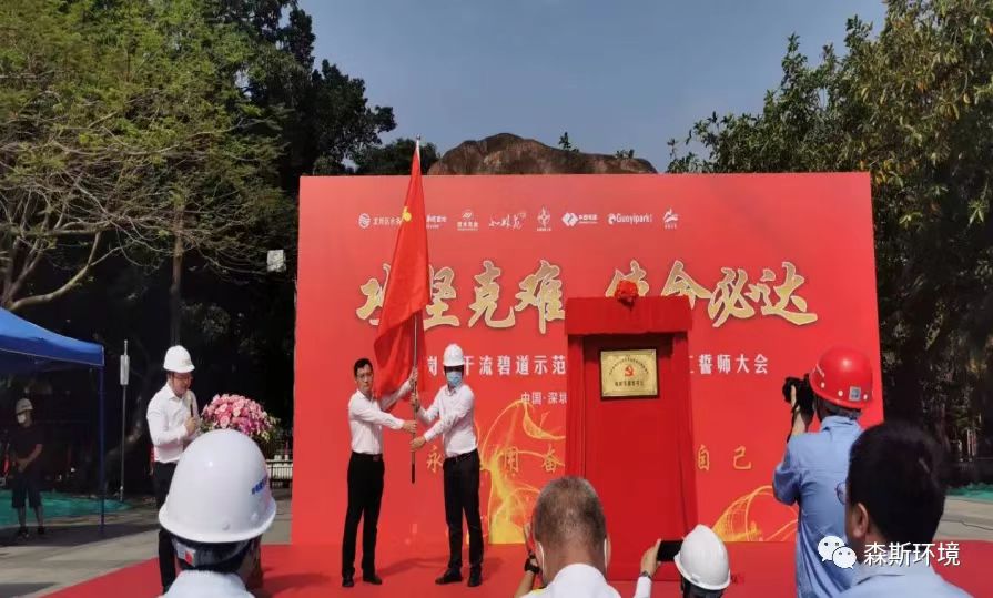 2022年04月15日上午,華潤(rùn)置地在龍崗河干流碧道項(xiàng)目示范段-龍園九龍壁現(xiàn)場(chǎng)組織召開了本項(xiàng)目“攻堅(jiān)克難、使命必達(dá)” 重要節(jié)點(diǎn)完工誓師大會(huì),并舉行臨時(shí)黨支部揭牌、授旗儀式。龍崗區(qū)水務(wù)局黨組書記、局長(zhǎng)李家康、區(qū)水務(wù)工程建設(shè)管理中心主任王寧、華潤(rùn)置地深圳大區(qū)副總經(jīng)理城市建設(shè)事業(yè)部總經(jīng)理李巍、森斯環(huán)境董事長(zhǎng)徐向明以及其他各參建方領(lǐng)導(dǎo)參加了誓師大會(huì)。