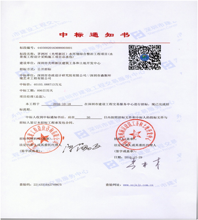 茅洲河(光明新區)水環境綜合整治中標通知