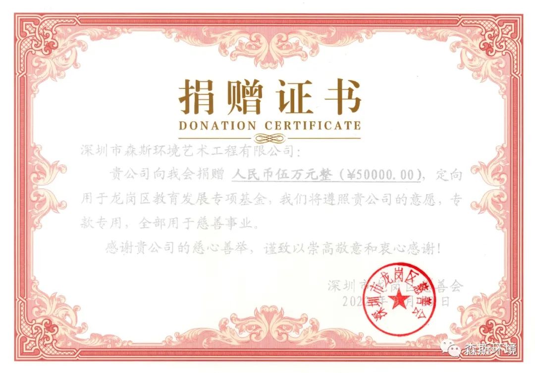 9月29日森斯環(huán)境積極響應(yīng)龍崗區(qū)開(kāi)展教育慈善和扶貧濟(jì)困公益活動(dòng),向深圳市龍崗區(qū)慈善會(huì)捐款伍萬(wàn)元,專(zhuān)款用于龍崗教育公益、鄉(xiāng)村振興事業(yè)的長(zhǎng)遠(yuǎn)發(fā)展。