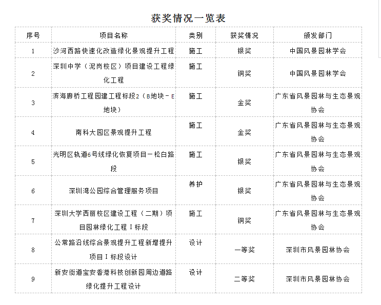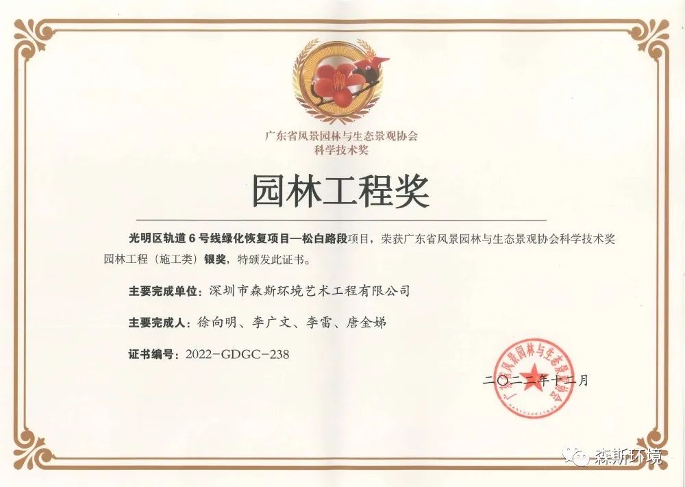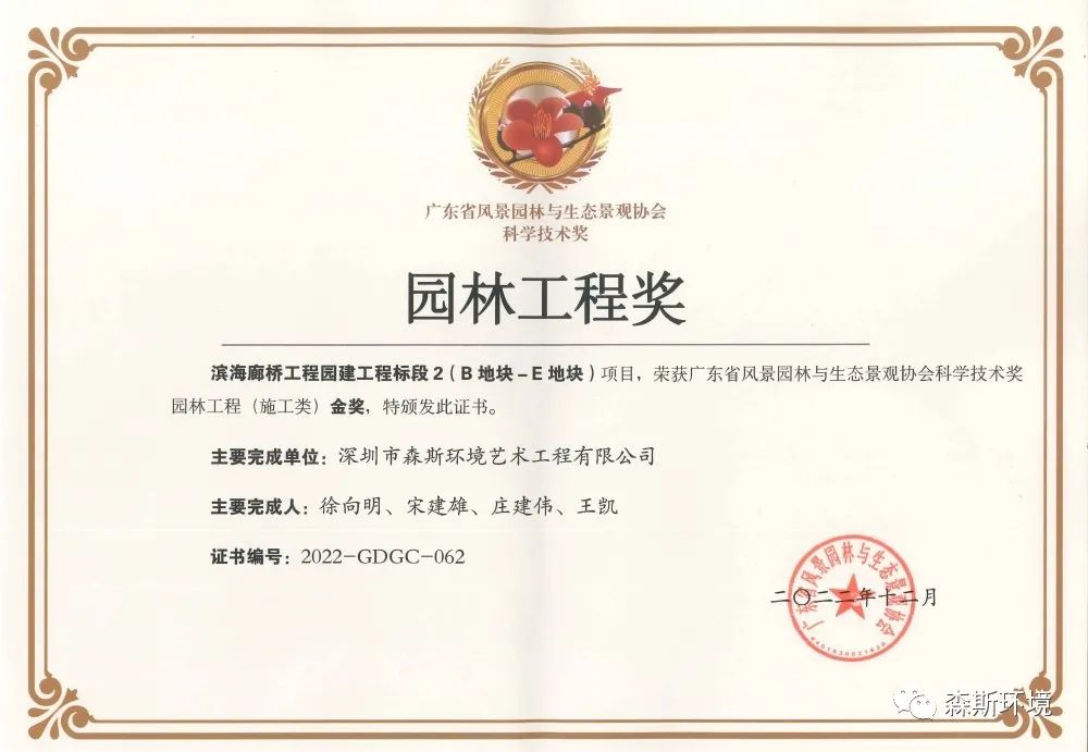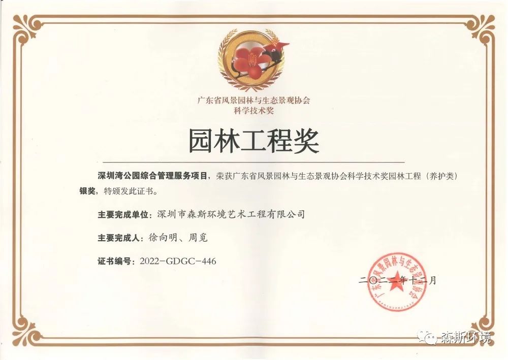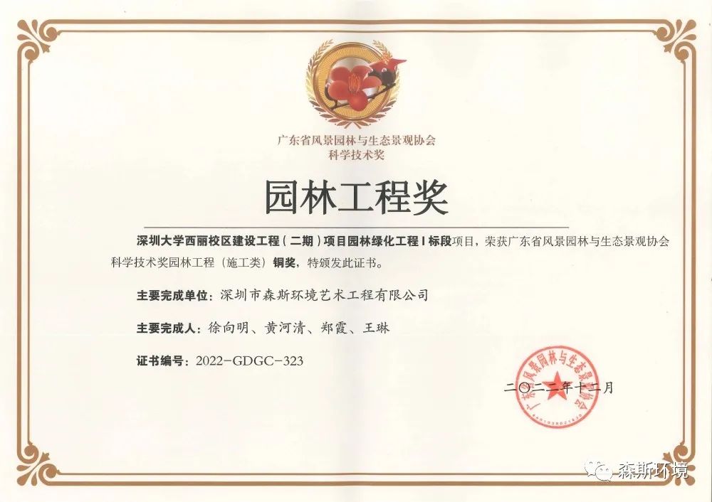 近日,中國風景園林學會、廣東省風景園林與生態景觀協會和深圳市風景園林協會先后公布2022年申報獎項的獲獎名單,森斯環境申報的設計、施工和養護項目,共榮獲3金4銀2銅“九項大獎”,成績斐然!
