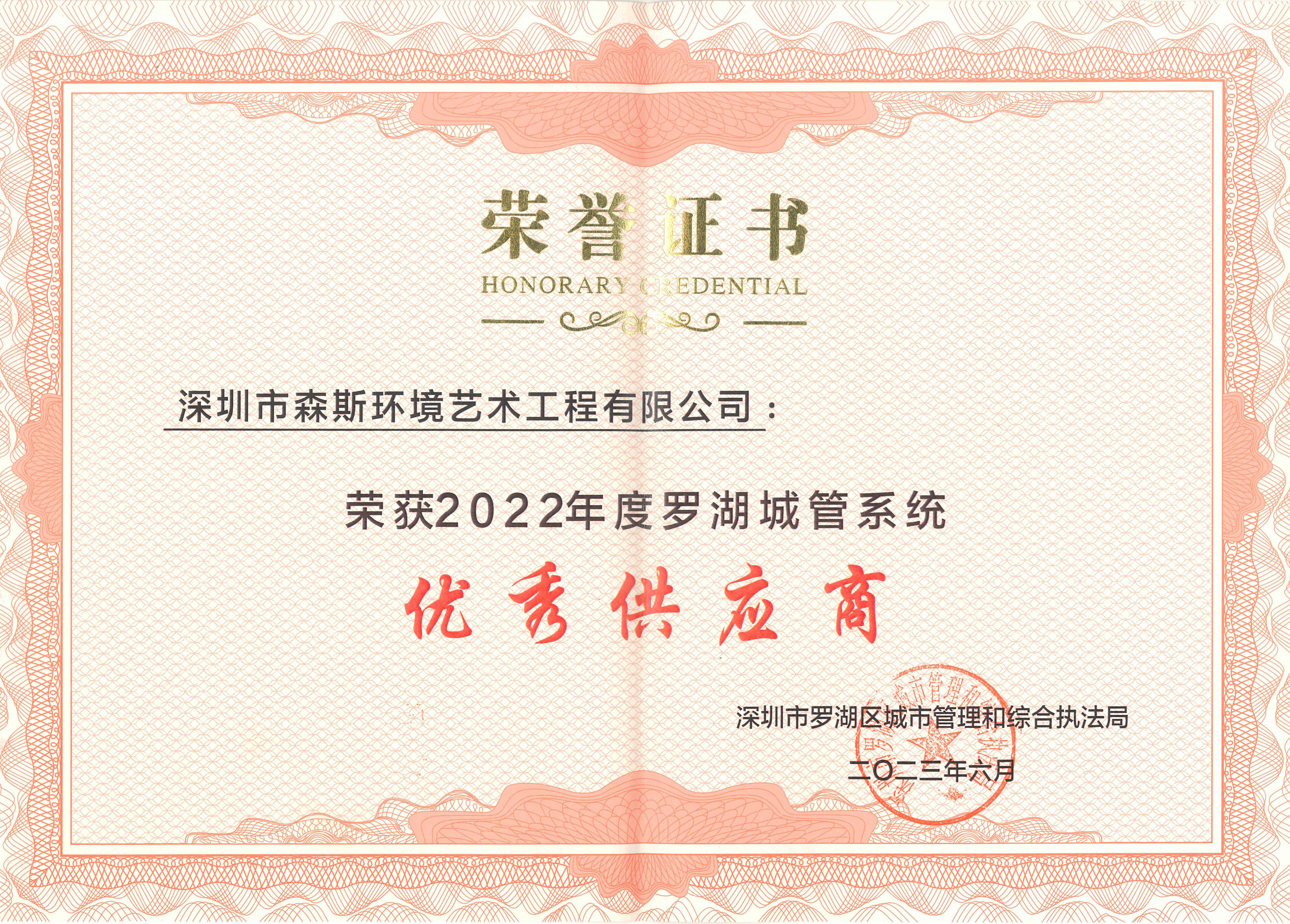 近期,深圳市羅湖區城市管理和綜合執法局開展了2022年度優秀供應商的評選工作,深圳市森斯環境藝術工程有限公司憑借其優異的服務意識、服務品質和服務效率順利入選并被評為:2022年度羅湖城管系統“優秀供應商”!