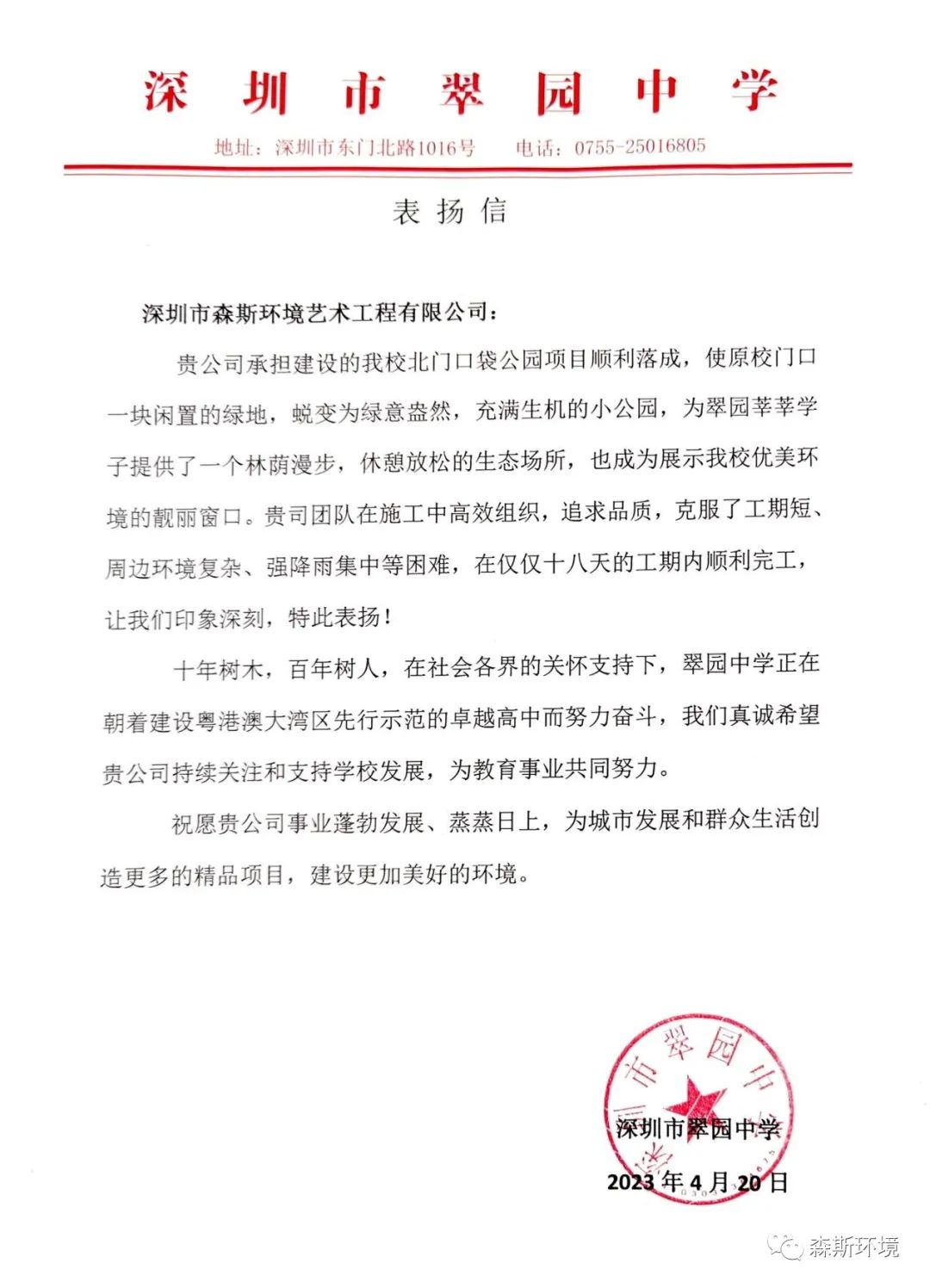 近日,森斯環境承擔建設的深圳市翠園中學北門口袋公園項目順利完成,公司收到深圳市翠園中學發來的表揚信!