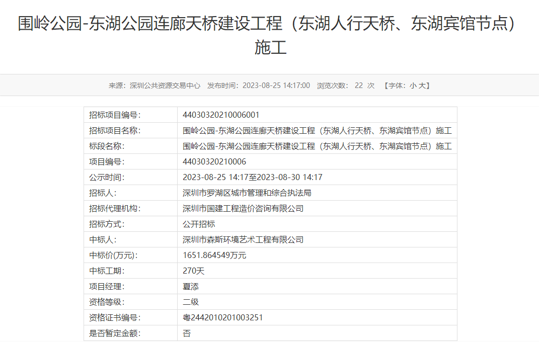 中標喜訊 | 凝心聚力,再創佳績!森斯環境中標圍嶺公園-東湖公園連廊天橋建設工程(東湖人行天橋、東湖賓館節點)施工項目