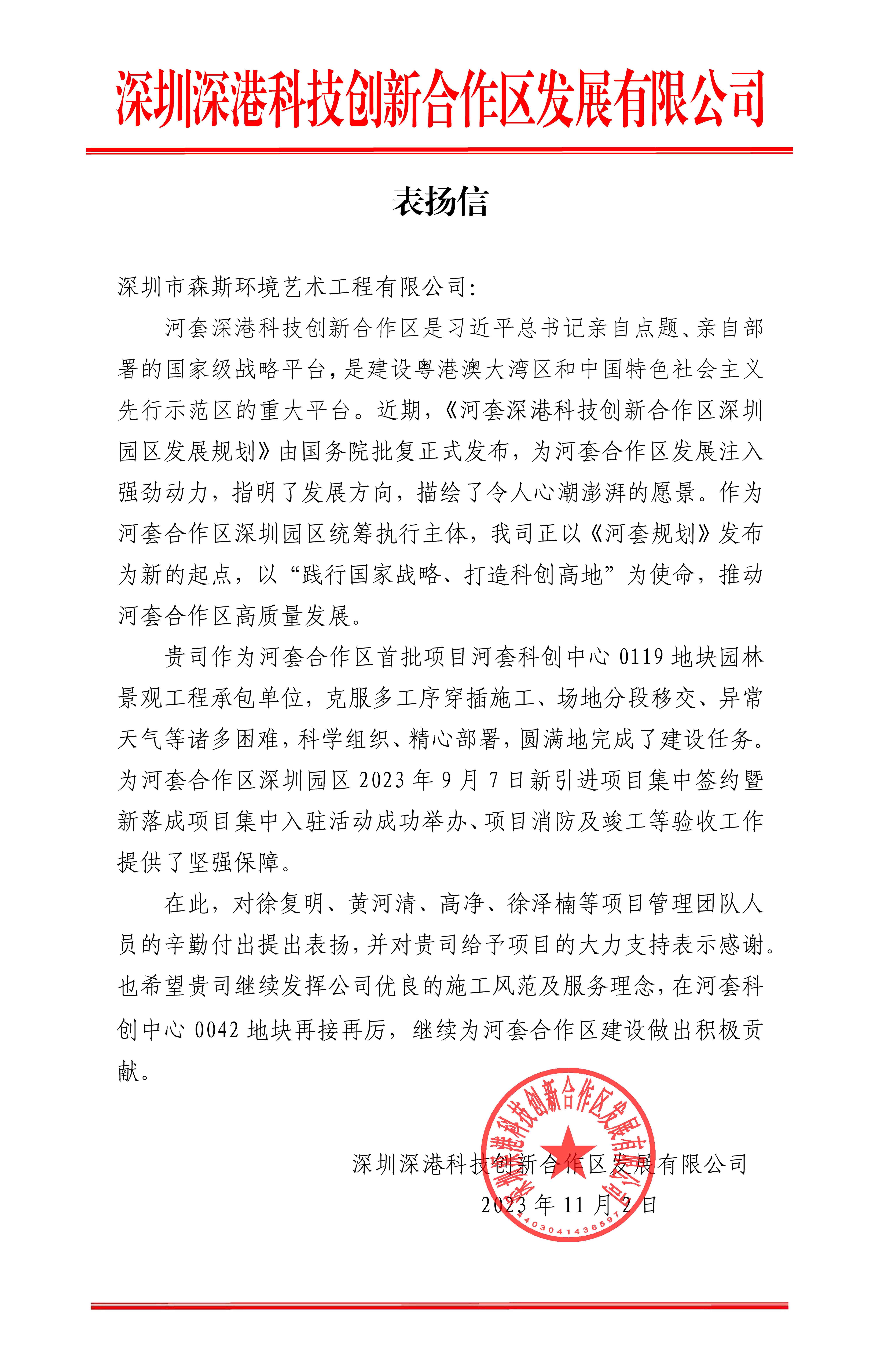 近日,深圳深港科技創新合作區發展有限公司發來表揚信,對森斯環境的施工成果給予高度的肯定和贊揚。信中指出,森斯環境作為河套合作區首批項目河套科創中心 0119 地塊園林景觀工程承包單位,克服多工序穿插施工、場地分段移交、異常天氣等諸多困難,科學組織、精心部署,圓滿地完成了建設任務,為河套合作區深圳園區 2023 年9月7日新引進項目集中簽約暨新落成項目集中入駐活動成功舉辦、項目消防及竣工等驗收工作提供了堅強保障。