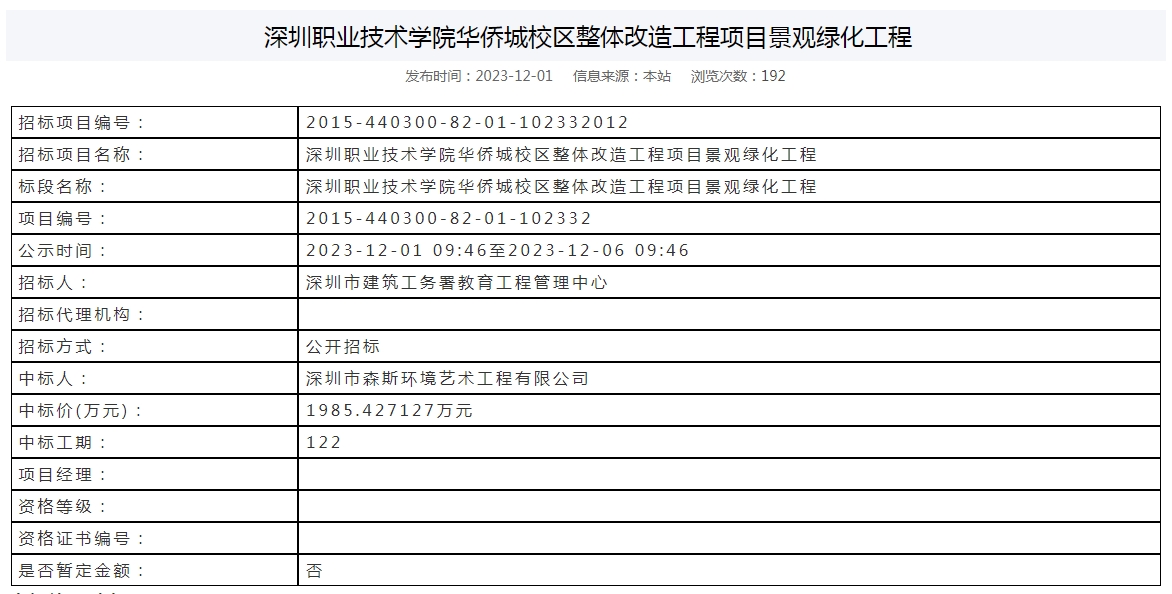 中標喜訊 | 森斯環境成功中標深圳職業技術學院華僑城校區整體改造工程項目景觀綠化工程!