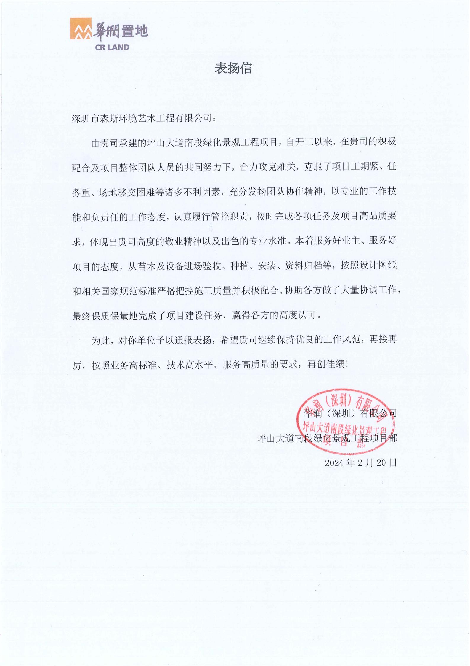 近日,森斯環境收到華潤(深圳)有限公司坪山大道南段綠化景觀工程項目部發來的表揚信,對我司承建的坪山大道南段綠化景觀工程項目的施工管理予以高度肯定!