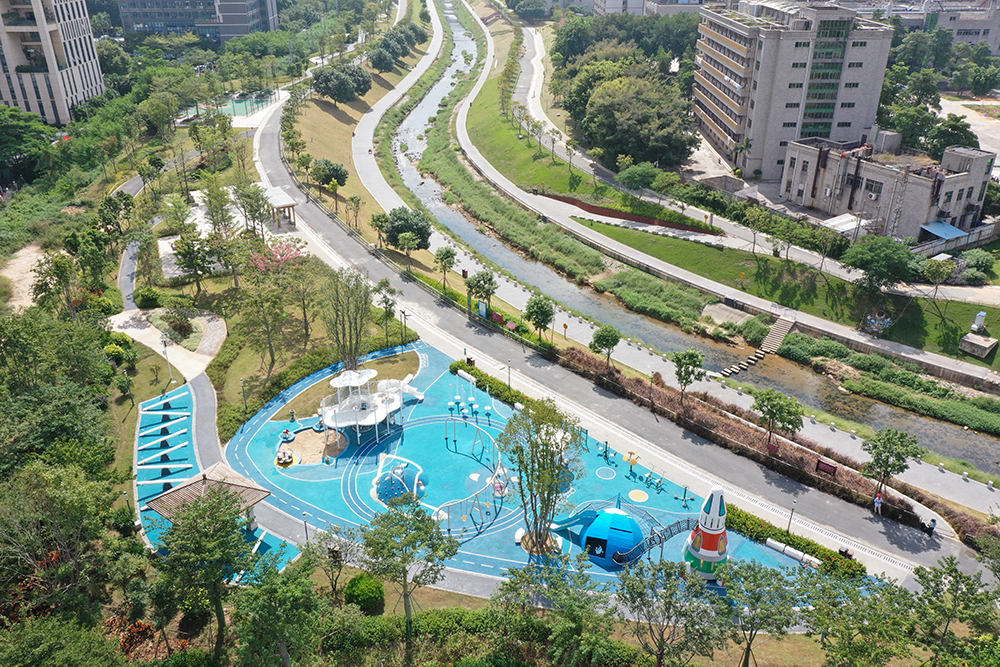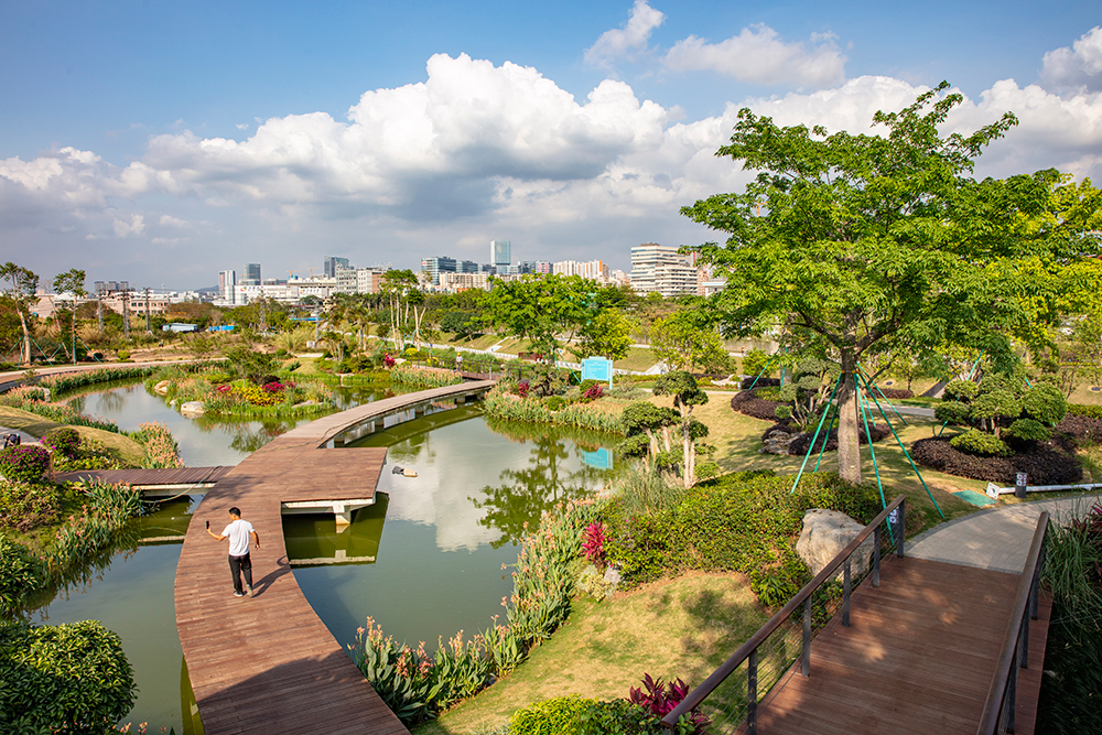 本項目長14.6公里,景觀面積91.3公頃,是集設計、采購、施工為一體的大型河道景觀綜合整治工程。主要景觀節點有茅洲之源、同觀濕地、茅洲畫卷、東坑橋、休閑運動場地、橋底體育運動公園等,是以高水平設計、高標準施工打造的光明區“生態脊梁”,是集水清、岸綠、景美于一體的茅洲河綠色生態長廊,為周邊居民提供了優質的休閑漫步空間。