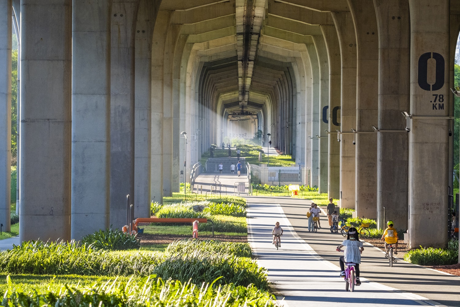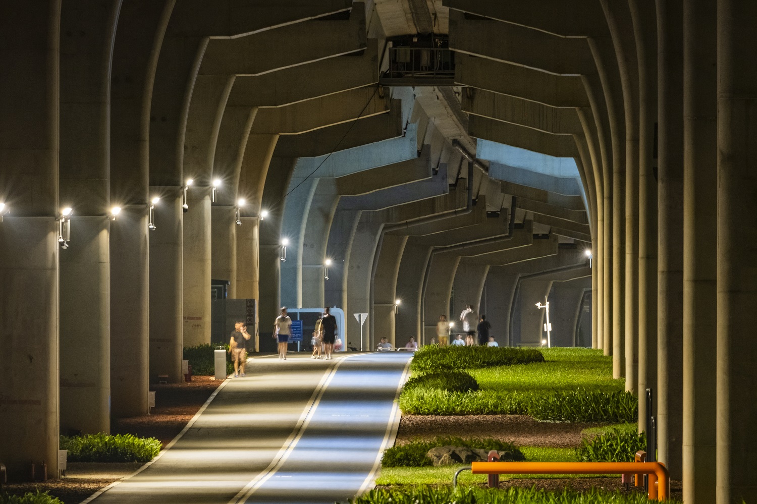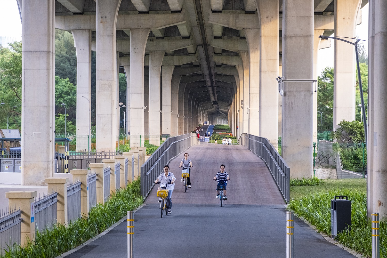 本項(xiàng)目北接金灣大道,南止歡樂港灣,全線位于廣深沿江高速橋下,全長6km,景觀建設(shè)面積37萬㎡,主要建設(shè)內(nèi)容包括人行道、慢跑道、自行車道、配套設(shè)施、環(huán)境提升等,是前海擴(kuò)區(qū)后落實(shí)深圳市“山海連城計劃”的重要舉措。作為一個全齡友好的綜合性“多元橋下空間”,西灣-前海灣慢行道設(shè)置了騎行道、人行道、跑步道三種道路,提供了科普教育、兒童游樂、運(yùn)動健身等豐富的休閑場所,有效拓展了城市的發(fā)展空間,更成為市民共享美好生活的“民生紐帶”。