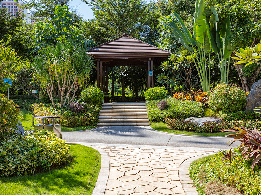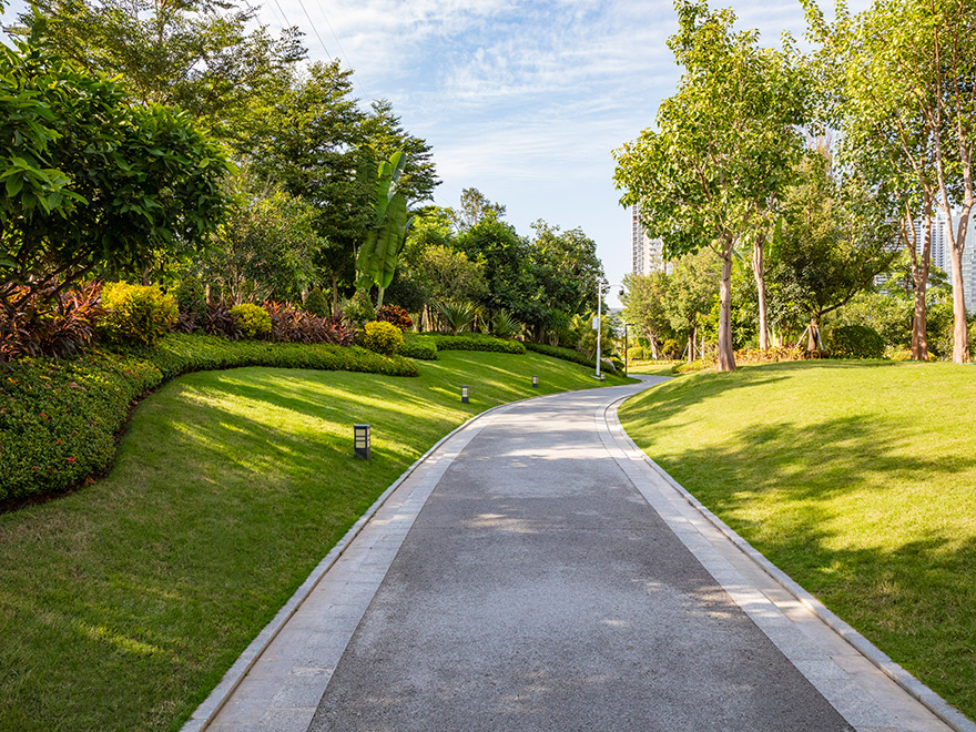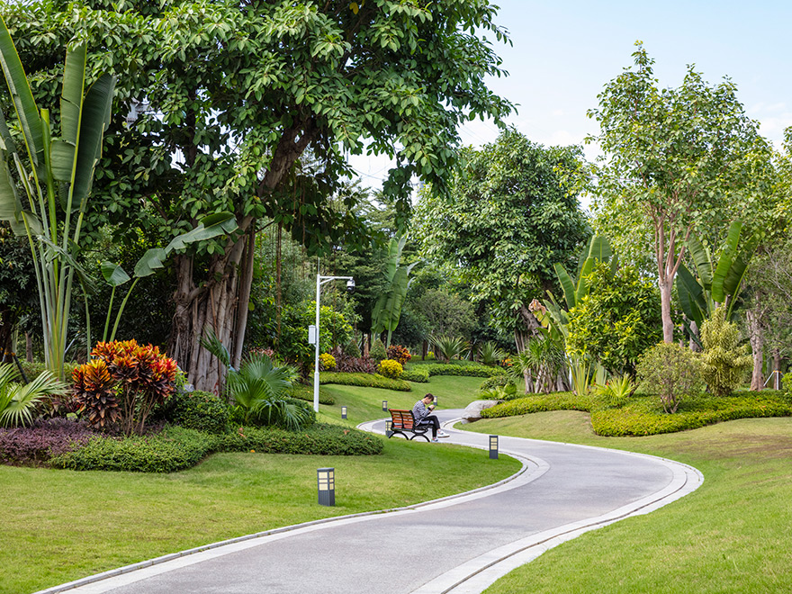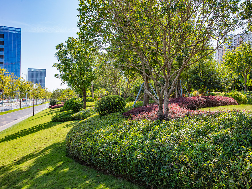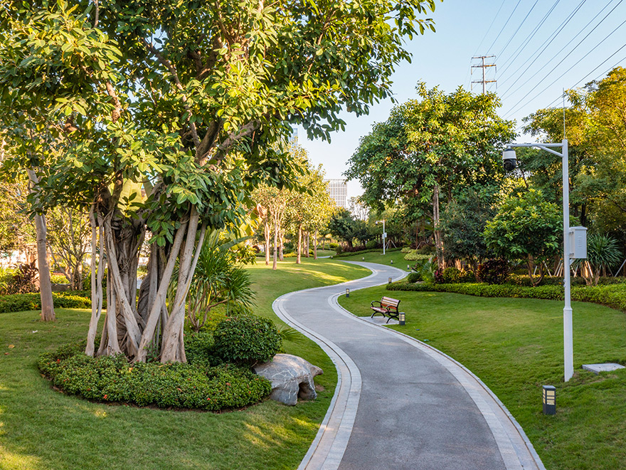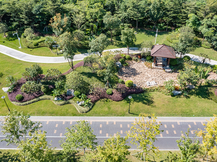 該項目將原綠化隔離帶改造成既是道路綠化帶,又是公園(鳳舉公園)。改造后集南國風光的大氣與江南園林的秀美于一體,地勢起伏有致,植物搭配合理,既有開闊通透的園路,也有曲徑通幽的竹林。旱溪蜿蜒靈動,生態功能與景觀功能共存;中西結合的原木連廊亭榭,盡顯自然與藝術融合;塑石假山與堆坡造型相得益彰。驅車行駛在鳳舉路上,感受到的是“高質量、高顏值”所帶來的震撼,人入其中,步移景異,讓人流連忘返,舒適愉悅。
