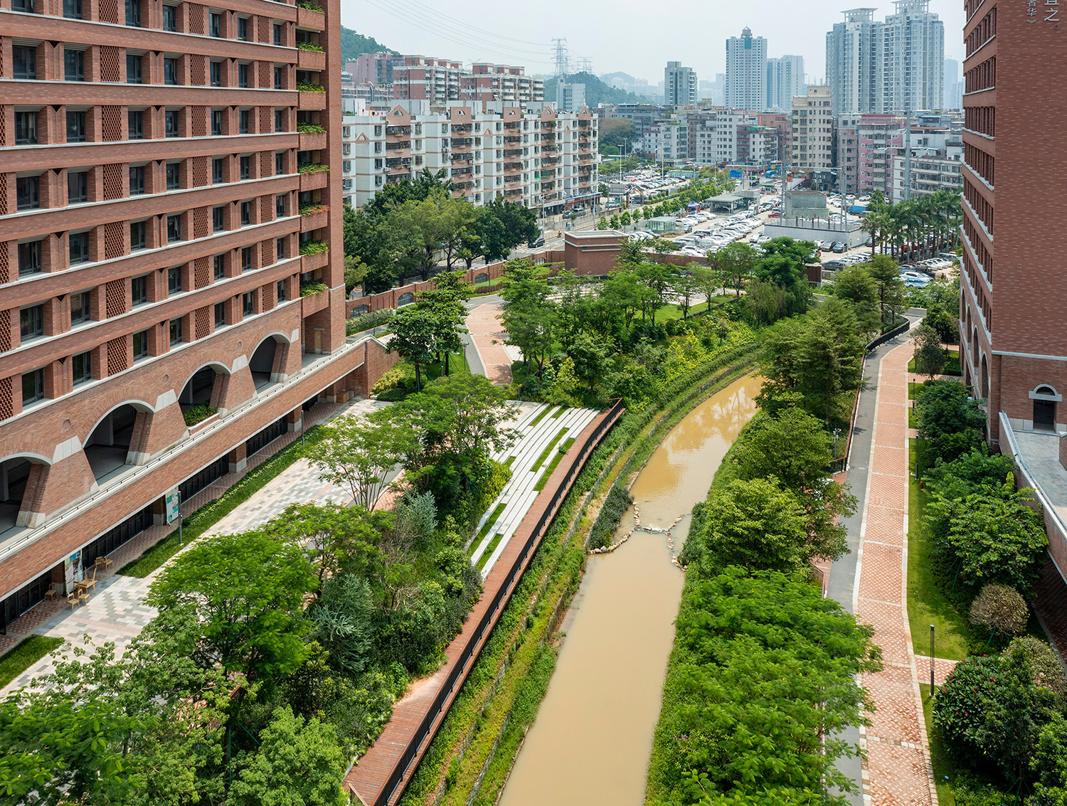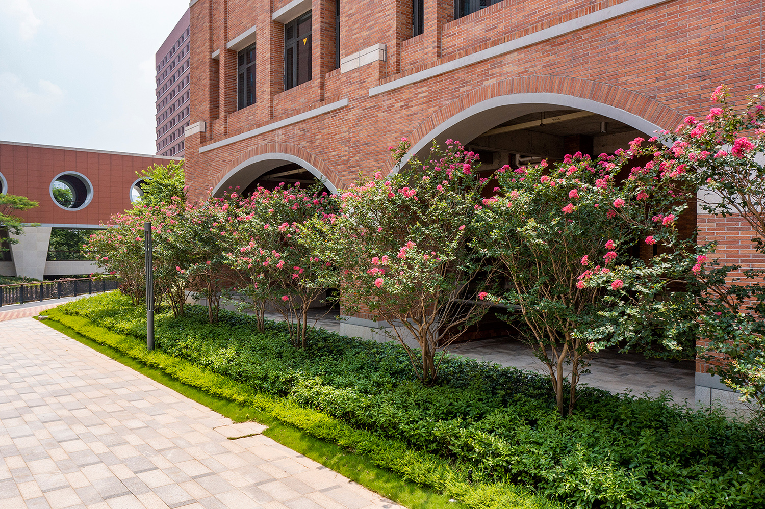 在景觀布局上采用地面綠化、平臺綠化、屋頂綠化相結(jié)合的方式;在整體平面上,利用大草坪、花園、架空層的區(qū)域整體性與通透性,打造與深圳精神“開放包容”一致的校園氛圍,形成了綠意盎然的生態(tài)校園景觀。在植物的配置上,優(yōu)先選擇鄉(xiāng)土植物作為基調(diào)樹種,采用適量外來引種植物點(diǎn)綴植物空間。教學(xué)區(qū)的植物主要以特大優(yōu)形樹種植,彰顯氣勢;運(yùn)動區(qū)則以打造常綠林蔭大道為主,局部點(diǎn)綴開花喬木,保證全年有花;生活區(qū)靈活利用植物的多樣性,達(dá)到一年常綠,四季有光的效果;而作為深圳中學(xué)的校樹—鳳凰木則貫穿園內(nèi)各處,用專屬景觀樹種渲染學(xué)子們對母校的歸屬感與榮譽(yù)感!本項(xiàng)目為學(xué)生們創(chuàng)造了一個勞逸結(jié)合的學(xué)習(xí)環(huán)境,也為老師提供了寓教于樂的場所與空間,讓景觀助力育人環(huán)境,也彰顯了深中建設(shè)中國特色世界一流高中的氣度與決心!