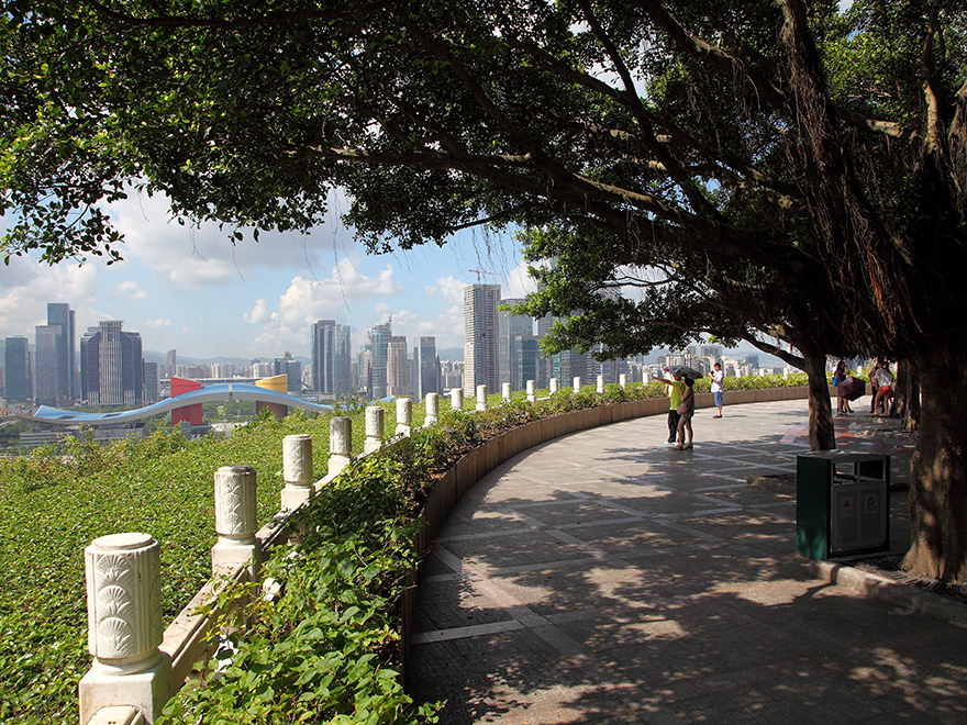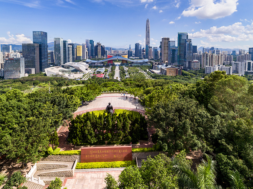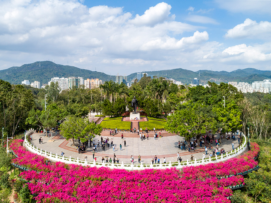 蓮花山公園位于福田中心區最北端,其山頂廣場面積4000平方米,中央矗立著改革開放總設計師鄧小平同志的塑像,2000年11月14日,江澤民總書記親自為銅像題字和揭幕?!吧徤酱涸纭笔巧钲诎司爸唬巾攺V場是市委、市政府接待貴賓的重要接待點,是愛國教育基地,是廣大市民和國內外來賓緬懷一代偉人風采、登高望遠、俯瞰羅湖和福田區全景的最好去處。